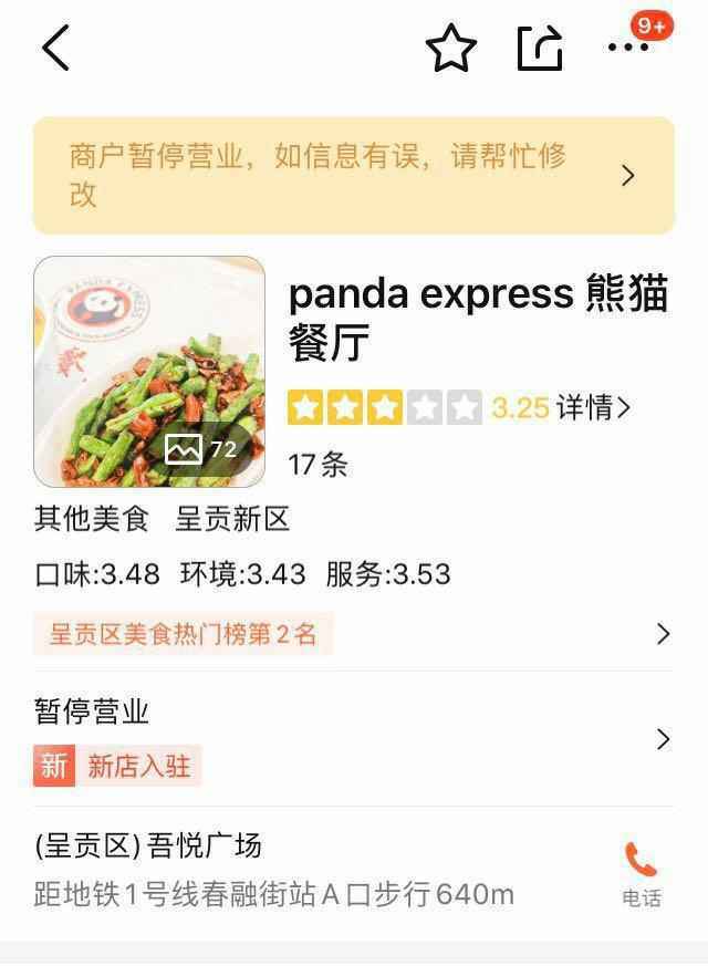 同样位于该吾悦广场的一位商户向记者透露,暂停营业应该就是这两天的事情,最近他路过门店时还看到挂着试运营的牌子。据悉,“panda express熊猫餐厅”是于上月25日正式开业,当时在商场内还进行了一波宣传活动,广场外还立有熊猫的雕塑。不过,该商户也向记者表示,认为该餐厅的口味一般,价格偏贵,一人食的午餐就要三五十元,对比商场内类似的自助餐厅,其菜品大多在10元以下。而且,该“熊猫餐厅”并没有对菜品明码标价,消费者只有取完餐结账时,才知道菜品的价格和自己的消费金额。